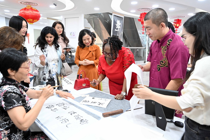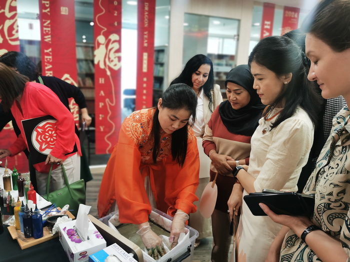在中国文化体验区,部分与会者首次看到汉字的书写,当发现一张张普通的纸张瞬间变成艺术作品时,惊讶不已,漆扇的制作更是当天活动的最大亮点,扇子成了最受欢迎的文创产品。女嘉宾们围坐在饮茶区,分享品茗心得,帕梅拉拿着亲手擀出的饺皮乐不可支。