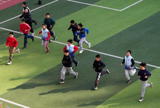 2月21日,在北京市宣武师范学校附属第一小学,学生在体育课上跑步热身。新华社记者 鞠焕宗 摄
