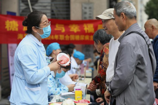 2024年11月14日在浙江省嘉兴市南湖区南湖街道文星社区,海警医院护士为居民进行健康饮食指导。新华社发(金鹏摄)