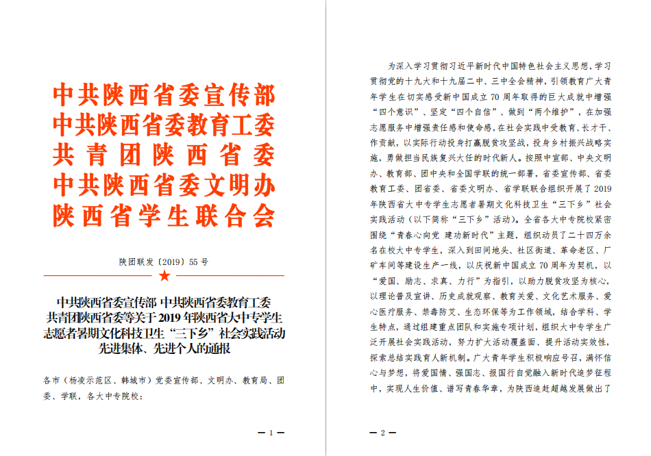 近日,省委宣传部、省委教育工委、省文明办、团省委、省学联对2019年全省大中专学生志愿者文化科技卫生“三下乡”社会实践中涌现出的先进单位和个人予以通报表彰,我院荣获省级“示范学校”称号,全省共16所高校校获此殊荣,高职院校仅两所,我院再次位列其中。同时习近平新时代中国特色社会主义思想宣讲团、“微帮”电商网销服务队、“春蕾”儿童安全五防宣讲团等三支志愿服务队荣获省级“优秀团队”,乔秋珍、刘振华两位教师荣获省级“先进个人”。