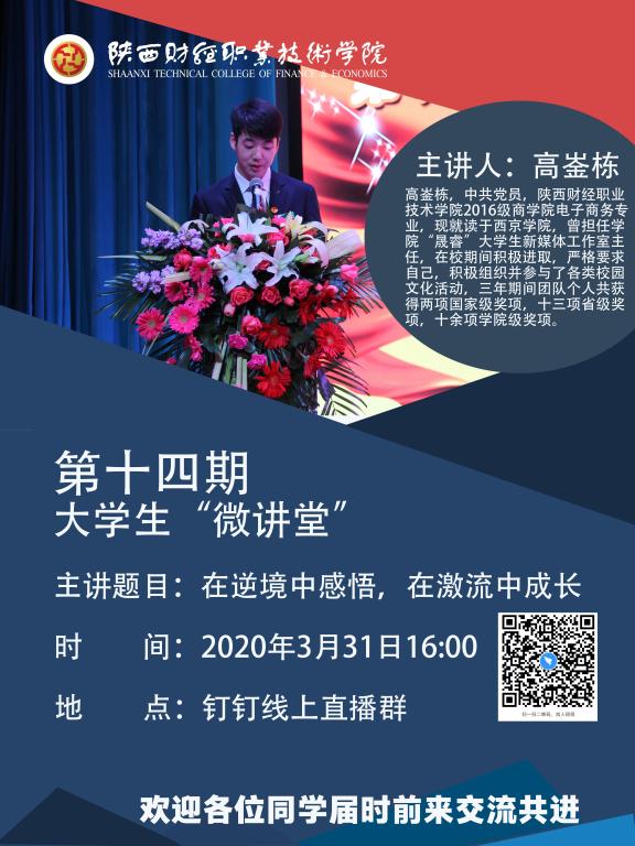 2020年3月31日16:00我院在钉钉线上直播群举行了第十四期大学生“微讲堂”活动。主讲人高崟栋带我们学习了“在逆境中感悟,在激流中成长”。参与此次活动的有各二级学院约3000余人