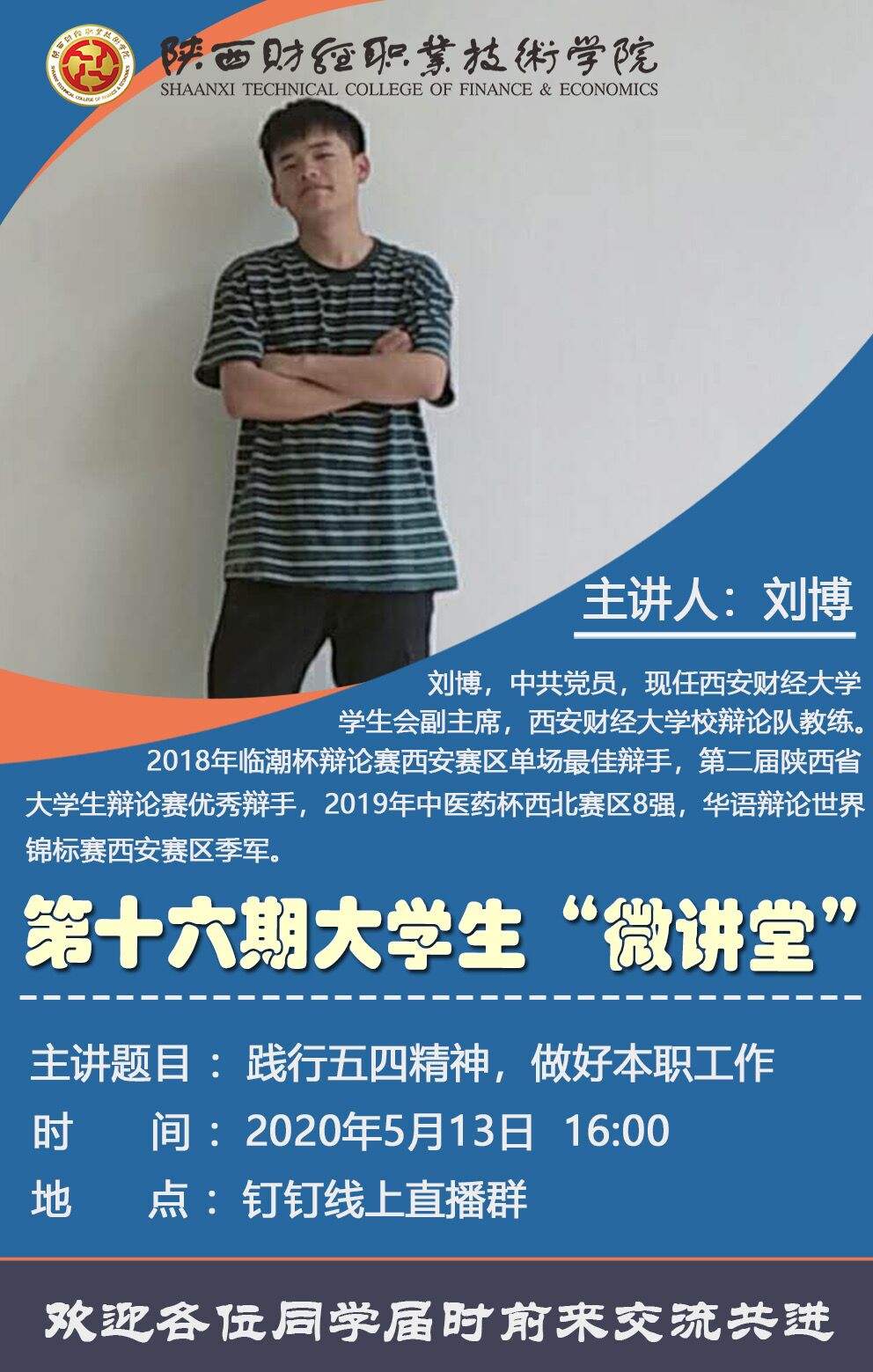 2020年5月13日16时,团委通过钉钉线上方式举行了2020年大学生“微讲堂”系列活动第十六期,本次“微讲堂”的主讲人是西安财经大学学生会副主席、辩论队教练刘博,主题是《践行五四精神,做好本职工作》,共2000余学生参与此次活动。