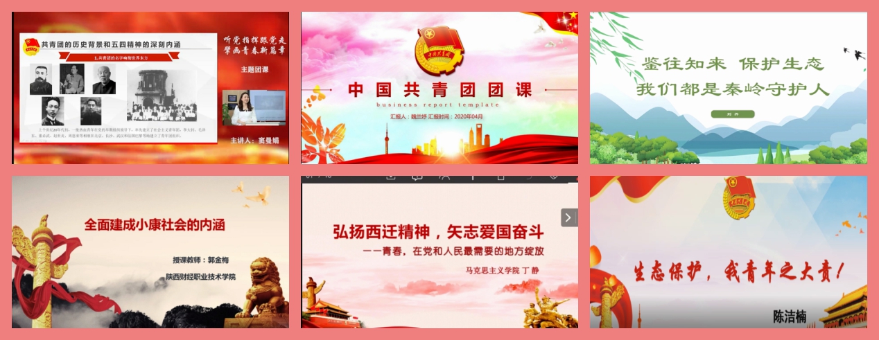进团课——6月5日开始,陕西财经职业技术学院团委组织开展了六场“青年讲师团”云端微团课主题宣讲活动,主要围绕学习习近平总书记来陕考察重要讲话及五四精神等内容,担任主讲人的是我院首届“青年讲师团”窦曼娟、魏兰妤、刘丹、陈洁楠、郭金梅、丁静六位老师。本次云端“微团课”全部采用网络视频授课的形式,围绕“听党指挥跟党走·擎画青春新篇章”、“薪火相传不负韶华”、“全面建成小康社会”、“弘扬西迁精神·矢志爱国奋斗”、“我们都是秦岭守护者”等主题,与全院同学共话使命担当。此次团课学习在全院上下掀起一股弘扬习近平总书记讲话精神的热潮,激励同学们做讲话精神的忠实研究者、积极传播者和坚定践行者。