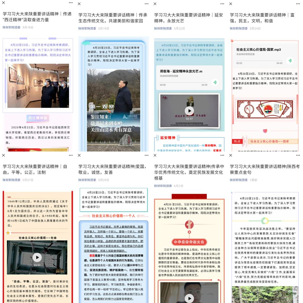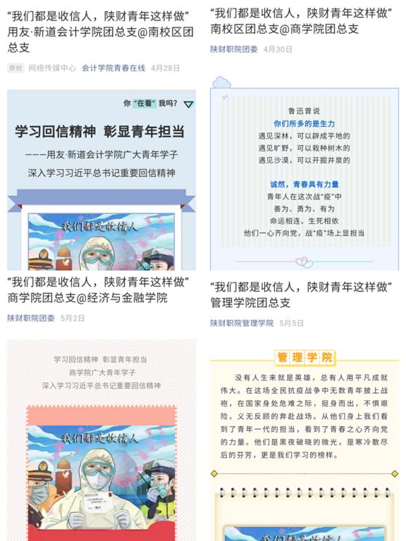 进网络——5月18日至6月3日,晟睿”大学生新媒体工作室充分发挥微博、微信等新媒体平台的作用,发起“我们都是收信人”、“学习习近平来陕考察重要讲话精神”等线上活动,以网上编创转发、话题讨论等形式,对团员青年进行思想引导和教育,促进习近平总书记系列重要讲话精神入脑入心。