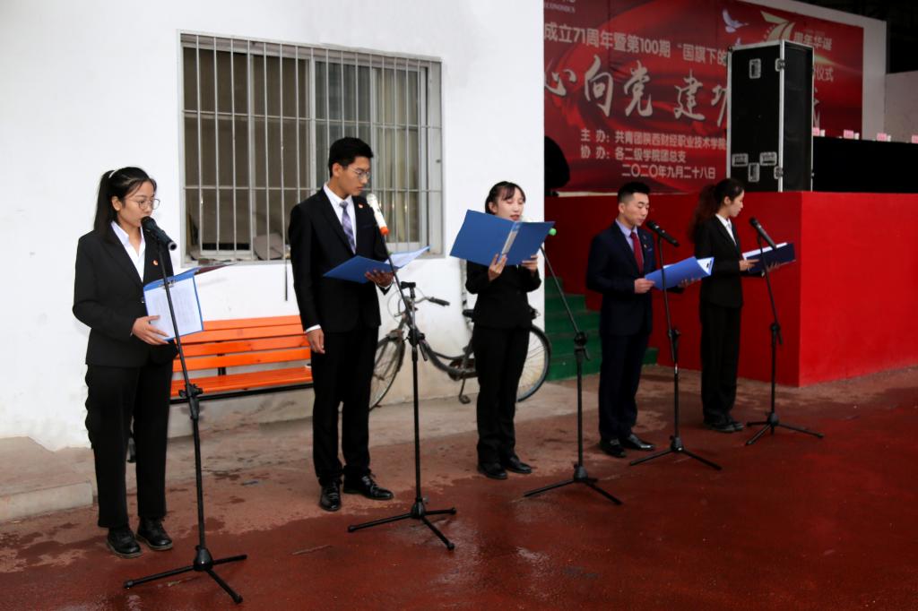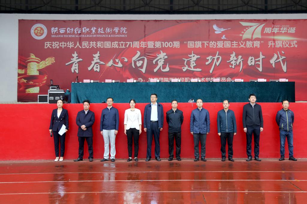 9月28日清晨7:00,我院在操场冒雨举行“青春心向党·建功新时代”庆祝中华人民共和国成立71周年暨第100期“国旗下的爱国主义教育”升旗仪式。学院党委书记张志华、学院党委副书记朱华斌出席活动,党委宣传部部长严丽丽、学生工作处处长乔晶策、用友·新道会计学院总支书记曾贵荣、大数据与人工智能学院总支书记曹耀辉,商学院党总支书记张晓战、经济与金融学院副院长陈冬、学生工作处副处长贺适以及各二级学院团总支书记、辅导员和学生代表500余人参加了升旗仪式。