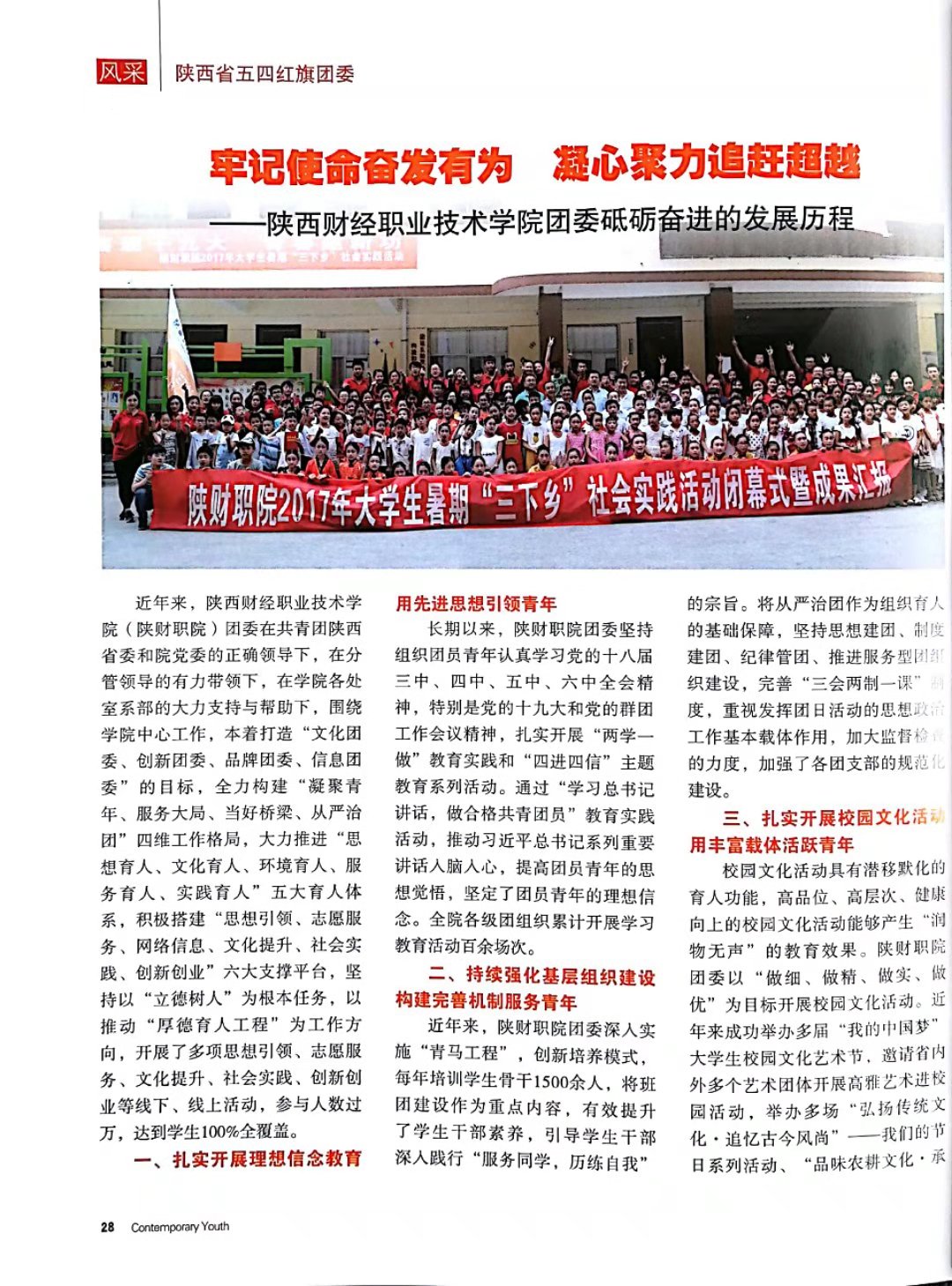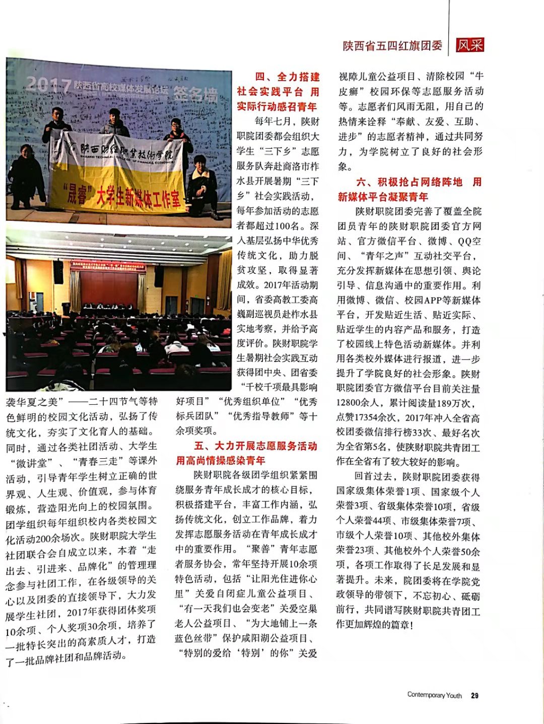 近期,共青团陕西省委主办的《当代青年》2018年9月版专版中刊发了题为《牢记使命奋发有为凝心聚力追赶超越——陕西财经职业技术学院团委砥砺奋进的发展历程》的报道。本次风采展示共刊发四所院校的共青团工作。