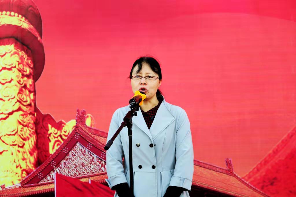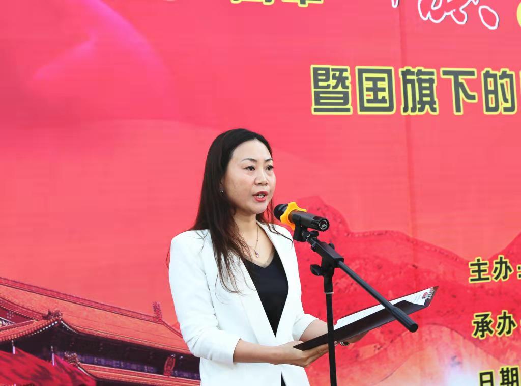 首先,严丽丽宣布仪式开始并出旗。英姿飒爽的国旗护卫队队员护卫着鲜艳的五星红旗踏着整齐的步伐入场。