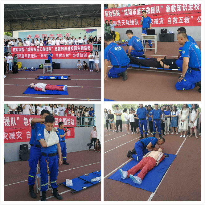 为配合我院创建“平安校园”工作,6月5日下午4:30,团委邀请咸阳蓝天救援队在我院塑胶操场举办了“防灾减灾 自救互救”为主题的急救知识培训,此次活动由团委主办,“聚善”青年志愿者服务协会承办,近千名同学参与到此次颇具意义的培训中。