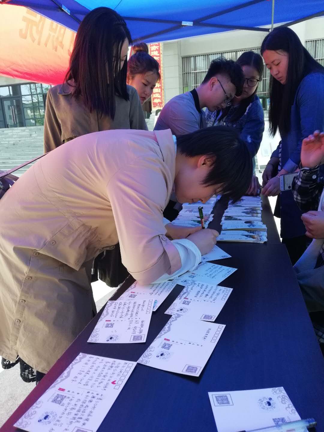 4月17日下午1:00,团委组织我院“聚善”青年志愿者服务协会的志愿者们在综合楼前举办了“四季邮局”明信片线下留言活动。我院千余名师生参与其中。