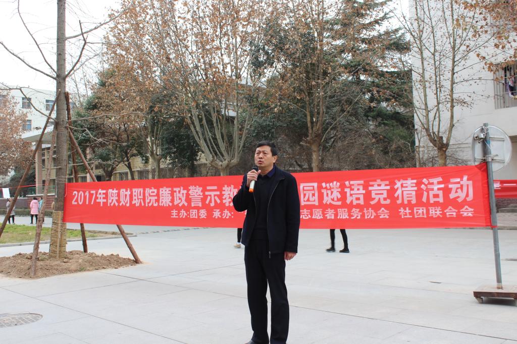 12月29日中午12:00,我院在综合楼前举办了2017年廉政文化知识教育之猜谜活动。参加本次活动的领导有学院党委书记张志华,党委副书记兼纪委书记刘文雅,纪委副书记刘静宇,纪委委员雷旭,纪委委员王爱军,纪委委员严丽丽,总务处及组织处党支部书记穆天楠,党群工作党支部书记窦曼娟以及学生党员代表共计400余人。