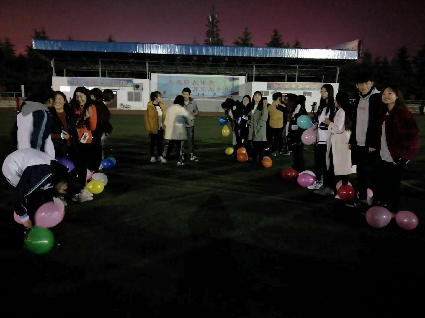 11月20日晚9:00,“聚善”青年志愿者服务协会学生干部在学院操场组织举办了“青春三走”主题系列活动之“‘爆’力气球”比赛,参与本次活动的学生共计200余名。活动形式为两人三足绑四个气球,在规定时间内留下气球最多的组员获胜。主持人一声令下,同学们鼓足士气,高喊口号开始活动,现场气氛热烈。活动中同学们手持荧光棒让漆黑的夜晚变成一场浪漫的荧光晚会。此项活动加强了同学之间的友谊,锻炼了沟通能力,增强了团队意识。