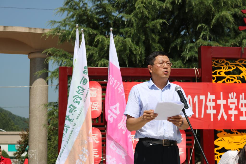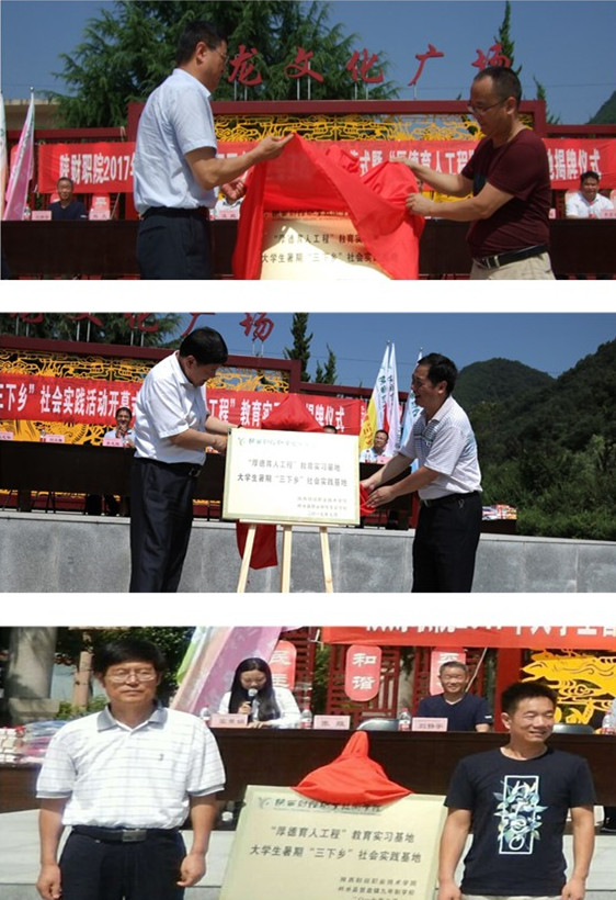 7月11日上午10:00,我院在商洛市柞水县乾佑镇盘龙生态产业园广场举行“厚德育人工程”教育实习基地揭牌仪式暨2017年大学生暑期“三下乡”社会实践活动开幕式。学院党委书记张志华、学院党委副书记兼纪委书记刘文雅、柞水县职业中等专业学校校长陈远益、营盘镇九年制学校副校长张维、柞水县城区第二小学校长熊炎、马房子村七坪完全小学校长李高军、柞水县科教局纪检组组长汪鹏出席了活动。我院财务处处长李志鹏、工会主席王爱军、宣传处副处长朱永斌、纪检监察审计处副处长刘静宇、组织处副处长穆天楠、党政办副主任宋波、带队及指导老师、全体志愿者以及参加本次“三下乡”社会实践活动留守儿童及家长代表参加了活动。活动由团委书记窦曼娟主持。
