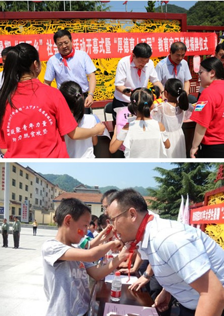 第一项穆天楠宣读了本次“三下乡”活动安排,明确了本次“三下乡”社会实践活动的实施步骤和具体要求。第二项我院志愿者代表张海松发言,他代表所有志愿者做出表态:在本次暑期实践活动中会秉承勤俭、朴实、奉献、自强的精神。尽己所能帮助他人,在社会实践中树形象、展风采、当先锋。热情洋溢的发言得到柞水县领导和群众的肯定。伴随着庄重的团歌声,四名国护队队员护送团旗上场,志愿者集体面对团旗进行宣誓,各队口号声音洪亮,响彻整个广场。第四项举行揭牌仪式,柞水县职业中等专业学校校长陈远益、营盘镇九年制学校副校长张维、柞水县城区第二小学校长熊炎、与我院党委书记张志华、学院党委副书记兼纪委书记刘文雅、宣传处副处长朱永斌上台共同为我院“厚德育人工程”教育实习基地揭牌,此举进一步加强了校地间的协作,加深我院与柞水县之间的友谊。第五项柞水县科教局纪检组组长汪鹏代表当地政府致辞。他首先对我院张书记一行以及我院大学生“三下乡”社会实践团的到来表示热烈的欢迎,对我院长期以来对当地扶贫工作给予的帮助表示衷心的感谢,并郑重保证此次“三下乡”活动涉及到的各部门定当齐抓共管,密切配合我院带队老师及志愿者工作,集中各自力量,形成工作合力,发挥整体效应。第六项我院党委书记张志华代表我院做了重要讲话,张书记对当地政府对我院此次活动的大力支持和配合表示衷心的感谢。并针对此次大学生暑期“三下乡”社会实践活动提出了三点希望:第一,希望带队教师和同学们一定要牢牢树立“安全第一”的思想,始终把安全工作放在首位。第二,希望大学生志愿者们把社会当作大课堂,虚心向人民群众学习,脚踏实地,勤思多问,努力提高自己发现问题、分析问题、解决问题的能力;要在实践活动中充分发挥我院大学生的自身优势,更好地服务群众、服务社会;在实践中提高自身素养,促进全面发展。第三,希望大家要敢于吃苦,不怕困难,发扬“奉献、友爱、互助、进步”的志愿者精神,坚持学习书本知识和投身社会实践的统一。第七项:受资助的留守儿童代表为我院领导系红领巾表达对我院师生的谢意,稚嫩的小手和坚定的眼神感动了每个人,我院领导亲切询问小朋友的学业生活等情况,并给予他们赞扬和鼓励。第八项:与会领导为营盘镇九年制学校、七坪完全小学的30名留守儿童捐赠了物资,表达了我院全体师生对山区学子的关怀。
