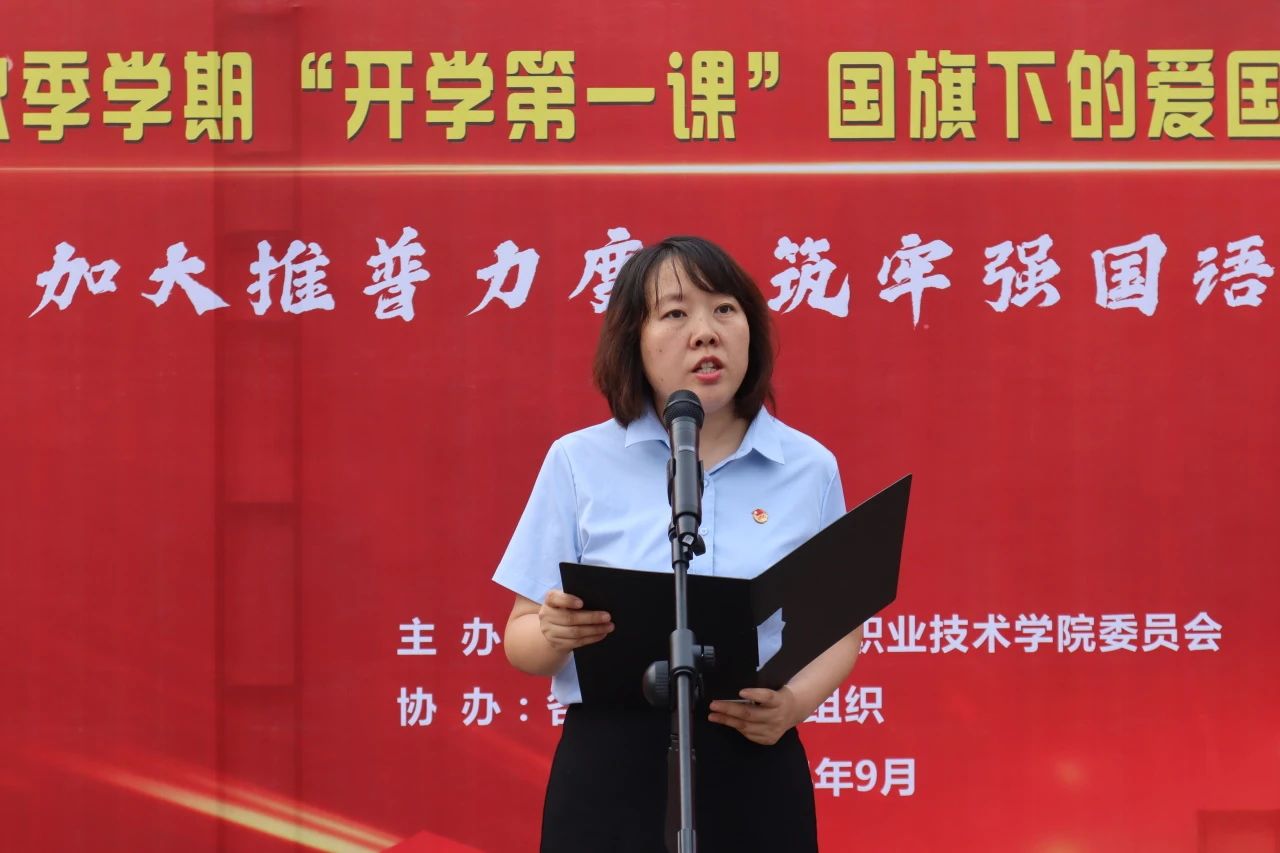 9月2日,我校团委在厚德育人广场举办了新学期“开学第一课”暨“加大推普力度 筑牢强国语言基石——国旗下爱国主义教育”升旗仪式。参加活动的有校团委书记、各二级学院团委书记、团组织负责人以及学生代表,共计600余人。活动由团委办公室主任连静主持。