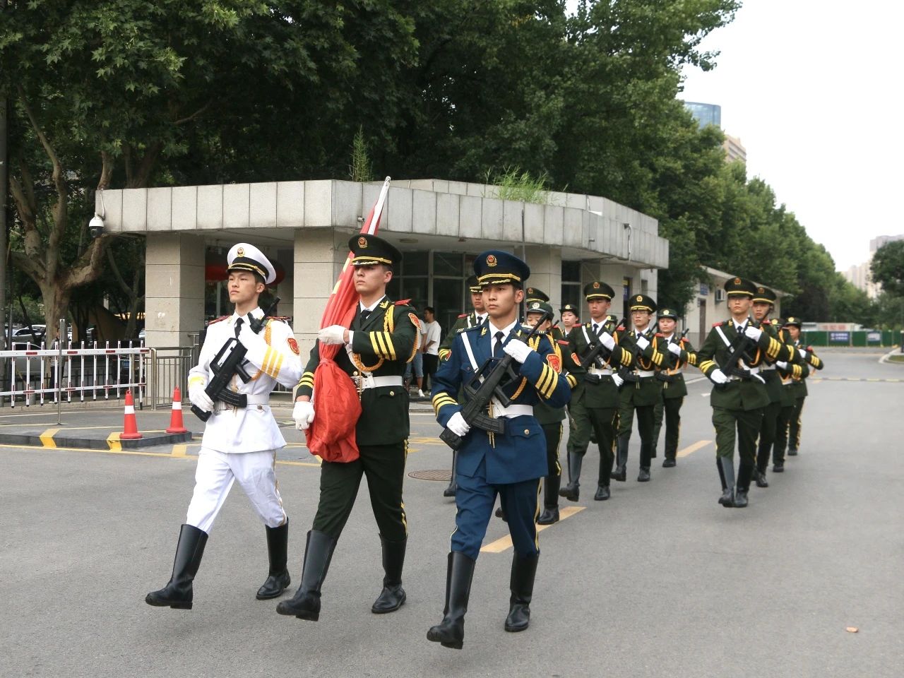 清晨七时整,英姿勃发的国旗护卫队成员,迈着刚劲有力的步伐护送国旗入场。《义勇军进行曲》响起,护旗手手把红旗,奋力一挥,鲜艳的五星红旗完全舒展开来,所有的目光随着跃动的红色一起升腾。这一刻,全场肃立,国旗与朝阳一同升起。