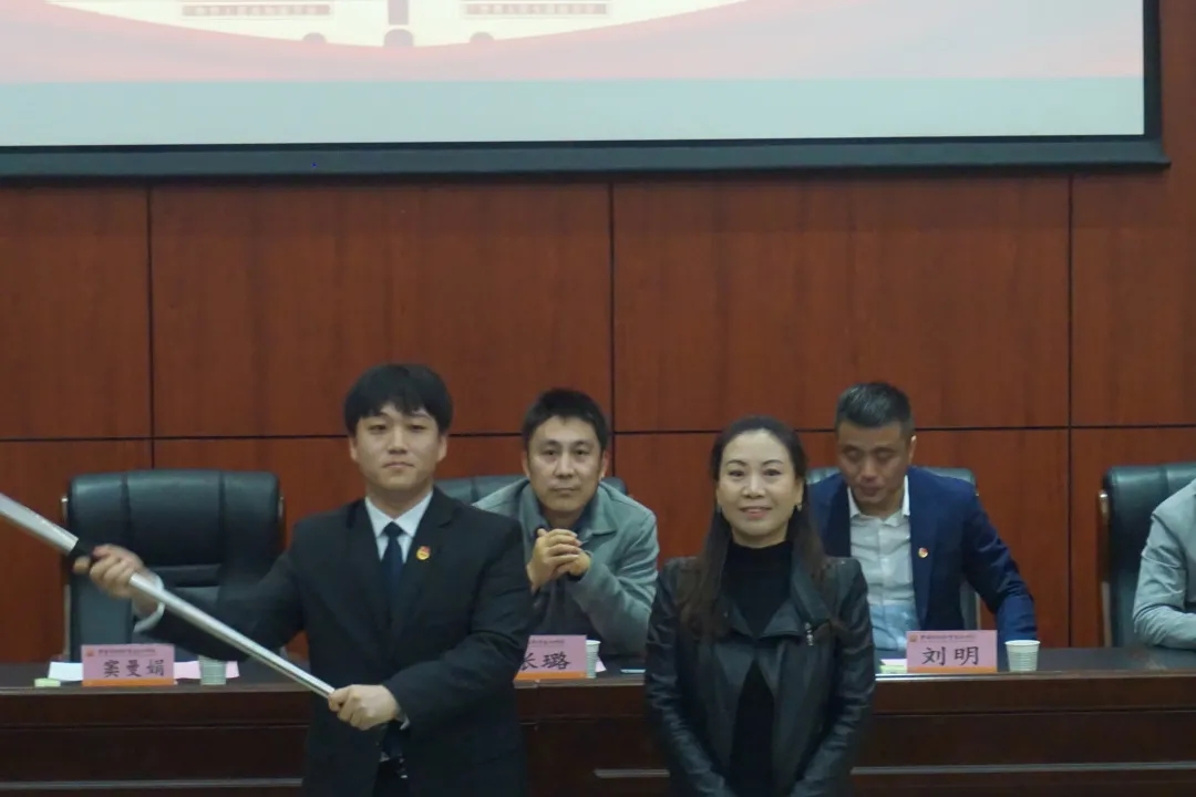 窦曼娟为第十二期“青马工程”培训班(大骨班)授旗,魏兰妤向第十二期“青马工程”培训班(大骨班)学员代表赠书。