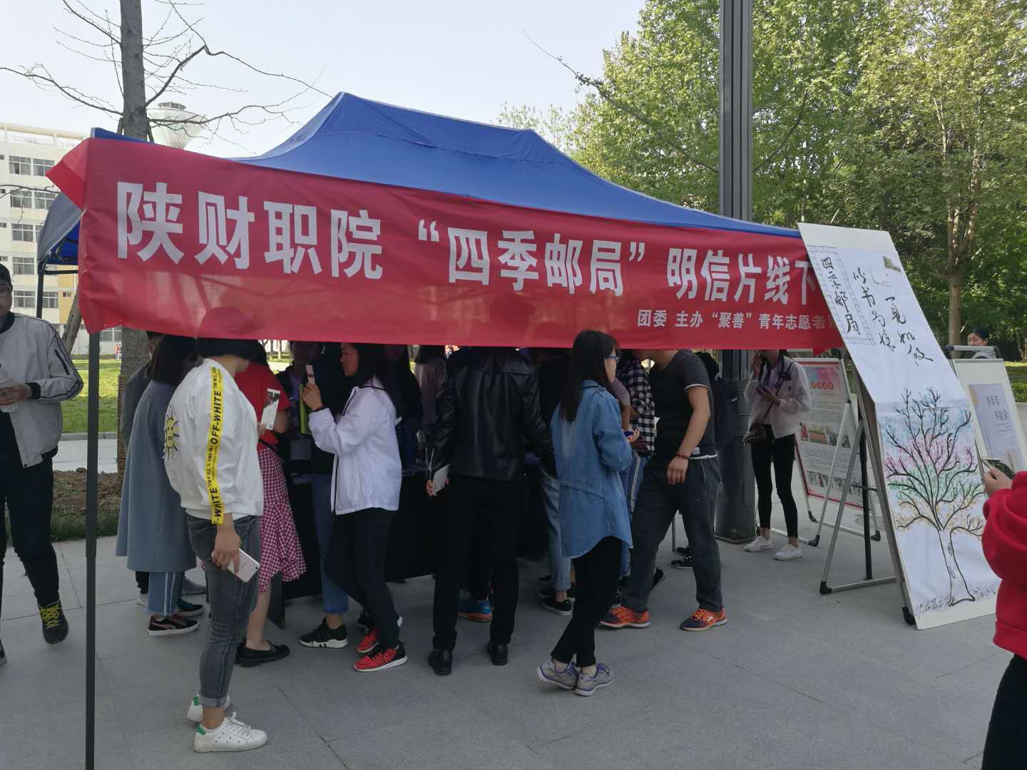 4月17日下午1:00,团委组织我院“聚善”青年志愿者服务协会的志愿者们在综合楼前举办了“四季邮局”明信片线下留言活动。我院千余名师生参与其中。