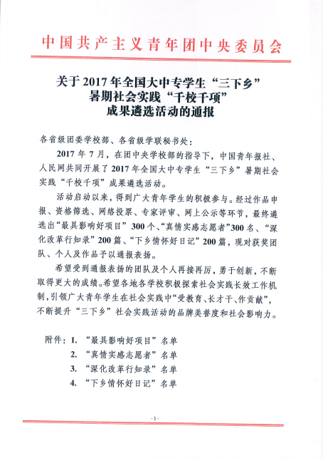 2017年11月22日,由团中央学校部及全国学联秘书处联合下发的《关于2017年全国大中专学生“三下乡”社会实践“千校千项”成果遴选活动的通报》中,我院团委申报的“科技支农项目”荣获“最具影响好项目”称号。全省共有四所高校获此殊荣,我院位列其中。