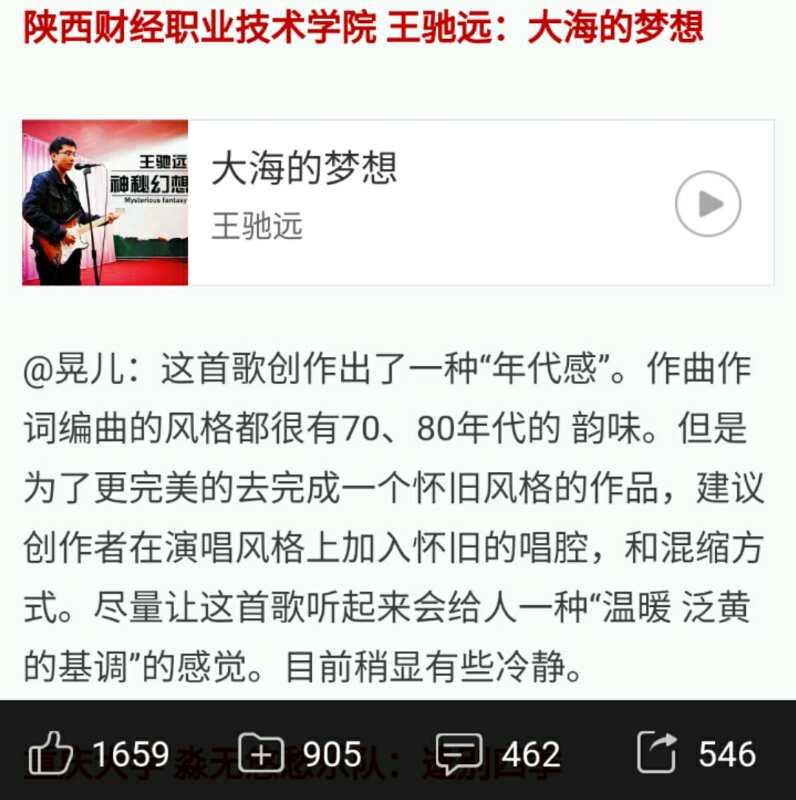 近期,在网易云音乐全国原创歌曲大赛中,我院大学生艺术团15级会计二系会计5班王驰远同学带着他的原创歌曲《大海的梦想》参加了大赛。全国共有163163名大学生提交了参赛作品,涵盖全国所有高校在校原创音乐人,王驰远成功入围,经过重重筛选获得全国第六名的好成绩,成为陕西地区唯一一位入围的前十名选手。