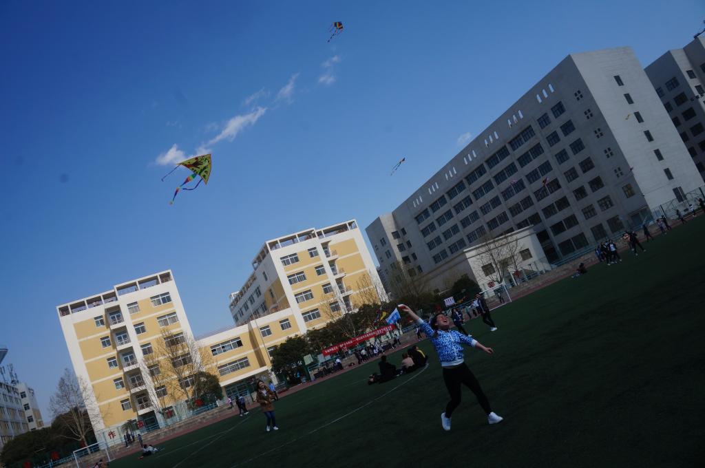 活动当天,操场上挤满了参加比赛的同学。随着哨声响起,每组参赛的风筝缓缓飞离地面,一时间蓝天白云下飘满了形态各异、色彩鲜艳的风筝。同学们在操场上热情的奔跑,各组选手齐心协力、默契合作,活动现场气氛异常活跃,欢声笑语在天空飘荡。