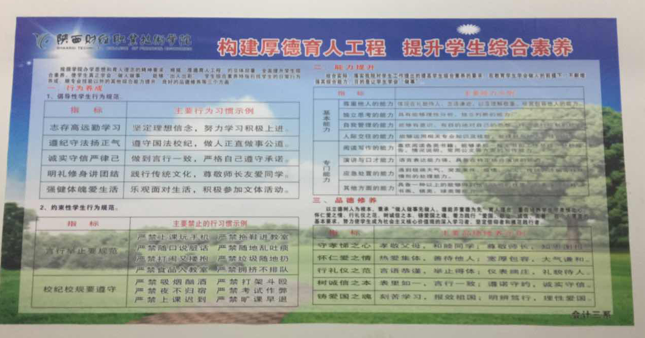 本次评选从板报内容、主题呈现、表现形式、整体效果四个方面进行评比,经过评委会成员的细致对比与商讨,最终评选出15个班级授予了陕财职院“厚德育人工程”主题板报评比优秀奖。