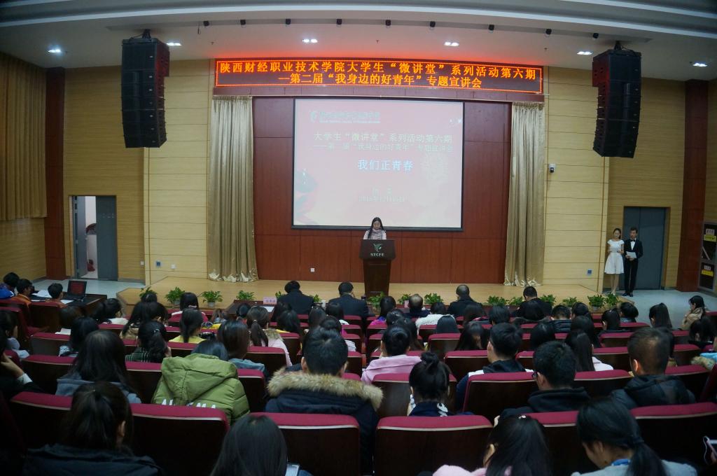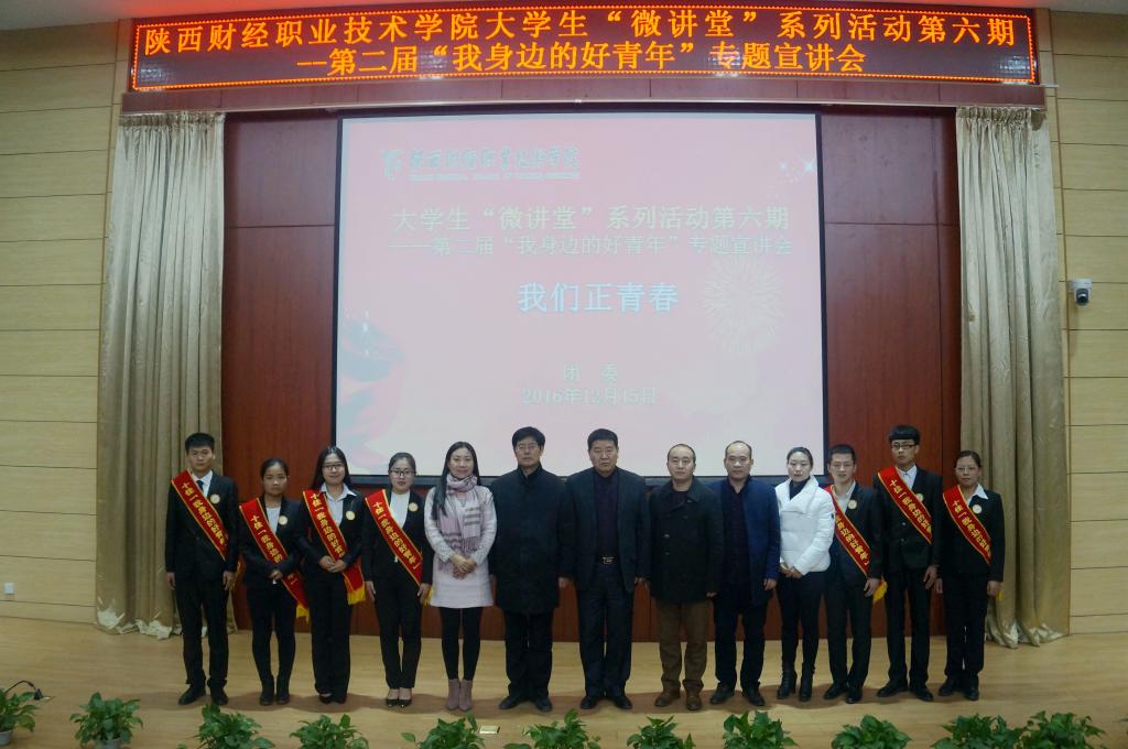 12月15日下午16:00,我院团委在学术报告厅成功举办了第六期大学生“微讲堂”系列活动之第二届“我身边的好青年”主题宣讲会---我们正青春。学院党委副书记兼纪委书记刘文雅出席此次活动,宣传处副处长朱永斌、会计一系专职副书记姚七栋老师、会计二系专职副书记乔晶策老师、学院团委书记窦曼娟老师、会计三系团总支书记吕斌以及我院八大学生组织干部、各班班长、团支书共400余人参加了活动。