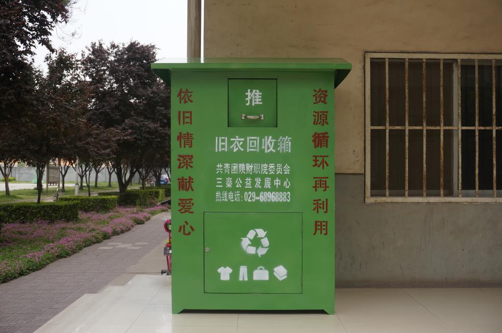 为了进一步促进我院志愿服务工作,引领学生正确践行社会主义核心价值观、弘扬中华优秀传统文化,经与咸阳市民政局、共青团咸阳市委多次协商,并报请学院领导批准,现在我院南北两院设立长期“旧衣回收箱”各一个,分别安装在南院女生宿舍楼前和北院宿舍楼C楼前。