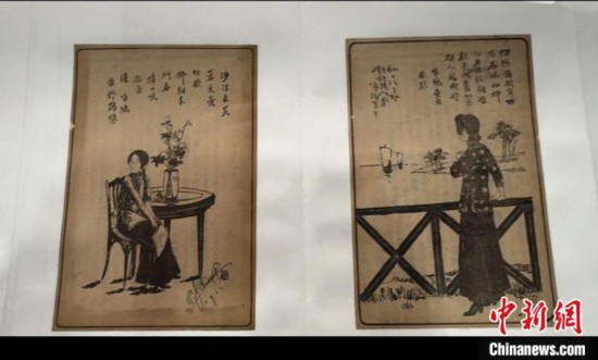 5月12日,“百年传承”——纪念20世纪艺术大师张大千诞辰125周年《张大千与上海文献展》在上海静安大风堂美术馆揭幕。图为现场展出的《民国日报》(上海版)上刊载的张大千“啼鹃”款人物画。 中新社记者 许婧 摄