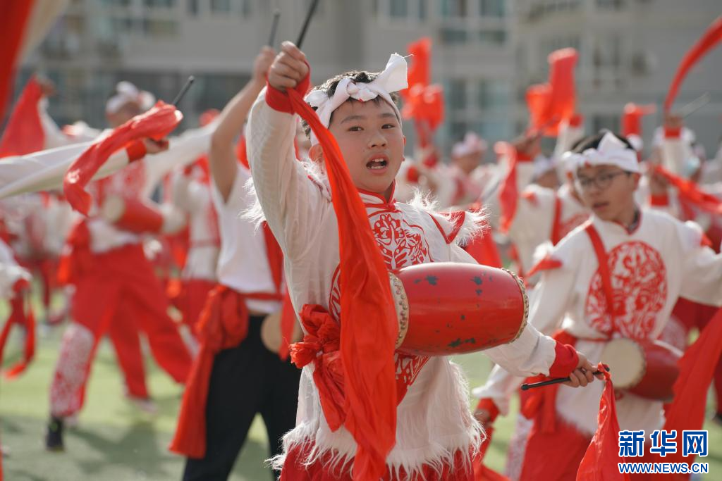 4月8日,西安辅轮中学学生在阳光体育大课间30分钟练习腰鼓。新华社记者 邵瑞 摄